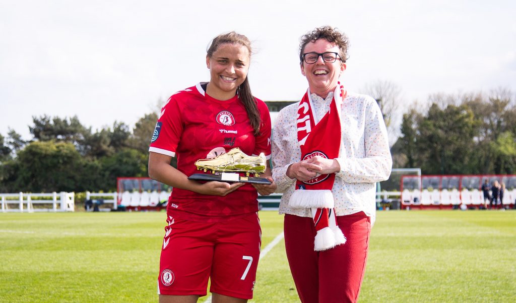Abi Harrison of Bristol City Women is presented with the Golden Boot award – Mandatory by-line: Will Cooper/JMP – 24/04/2022 – FOOTBALL – Robins High Performance Centre – Bristol, England – Bristol City Women v London City Lionesses – FA Women’s Championship